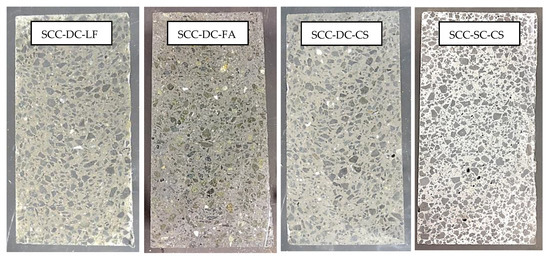 In the comparison between SCC-DC-LF and SCC-DC-CS, it can be concluded that there are no significant differences in any of the properties shown between the limestone filler and the cupola slag SCM, it being necessary to analyze the mechanical properties of both mixes to establish the benefits of each filler. The visual aspect of each mix in the hardened state is shown in Figure 3, where a better orientation of the aggregates in the filling can be seen in the SCC-SC-CS mix.