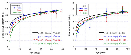 Figure 4 shows the results of the mechanical properties of mortars that incorporate several replacements of Portland cement. Compressive strength increases with the age for all replacements following a logarithmic trend (R2 ≈ 0.85), while intermediate replacements shows intermediate behavior between maximum replacement and reference mortars. After 7 days, mortars with a 30% replacement show a 27% loss in compressive strength with respect to the reference mortar, showing a slow rate of hydration reactions. This loss is reduced to 12% at 28 days and 5% at 60 days. At 90 days, the strength shown for all replacements tends to converge because the start of hydration of the alite and the peak of hydration occur much later when using cupola slag SCM than when using Portland cement (the speed of the reactions is slower when using cupola slag) [38].