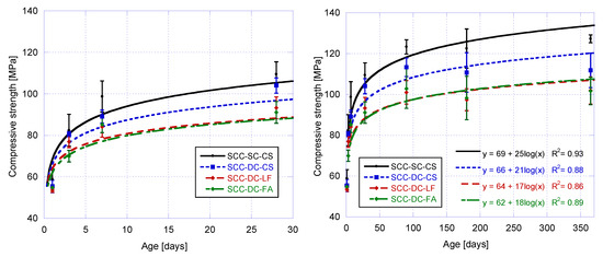 Evolution of the compressive strength for the different mixes: the first at 28 days (left) and the second at 360 days (right).