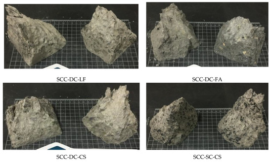 In Figure 7, the appearance of some of the cracking of the cubic specimens tested at 365 days is presented. As can be seen, due to the high stress applied to these concretes and the excellent paste–aggregate interface, the crack planes have propagated through the paste and aggregates, releasing all their energy through explosive cracks.
