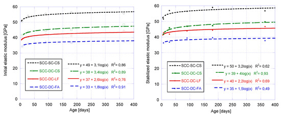 Evolution of the initial elastic modulus (left) and the stabilized elastic modulus (right) for the different concrete mixes.