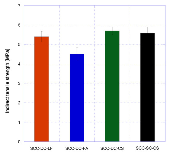 The results of tensile splitting (Brazilian) strength for all mixes at 90 days are presented in Figure 9. Among all the mixes that use natural aggregate, it is observed that SCC-DC-FA has the lowest tensile splitting strength (4.5 MPa), due to a high porosity and a lower bonding in the interface transition zone favored by the smooth surface of the fly ash particles. The SCC-DC-LF mix is the next one with the highest tensile splitting strength (5.4 MPa), slightly lower than SCC-DC-CS (5.7 MPa), where once again the reactive character of the cupola slag SCM shows an improvement of the mechanical properties. For this property, there are no differences between using natural aggregate or siderurgical aggregate, as shown by the comparison between SCC-DC-CS and SCC-SC-CS (5.6 MPa), showing that the bonding strength in the interfacial transition zone (ITZ) is similar (good quality) for both aggregates.