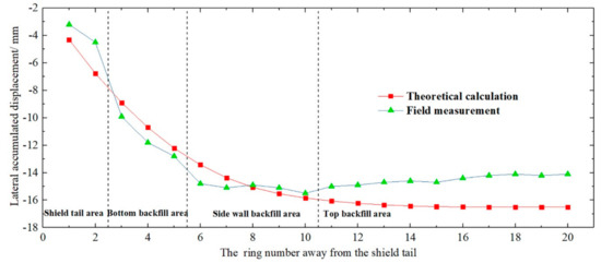 - When the segments leaving the tail around nine rings, there is a big difference between theoretical results and field data. When the pea gravels form the ring, the lateral accumulated displacement declines slowly under the pressure difference of surrounding rocks and tends to be stable from the 17th ring. For the theoretical simulation, the pressure difference of surrounding rocks from both sides of the shield line is ignored as the 3D tunnel is simplified as the 2D circular curved beam in the model. The simulated accumulated displacement increases slowly from the 11th ring and tends to be stable from the 15th ring.