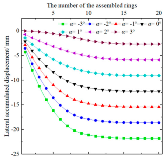 - In the process of segments leaving the shield tail around 1 to 4 rings, the simulated accumulated lateral displacement agrees well with the lateral displacement from the field. Compared with the monitored data, the simulated results are a little underestimated. The curvature radius in this project has already reached the turning limitation of the TBM. The poorly controlled shield posture and the improper selection of assembly position can cause the squeezing action of the second ring in the shield tail from the shield shell or the tail brush. The squeezing action also causes the increase of lateral offset of some rings, which just leaving the tail and are backfilled. The first ring leaving the tail is most influenced by this effect. From the field data, we can know that the lateral displacement increases rapidly when the ring leaves the tail.