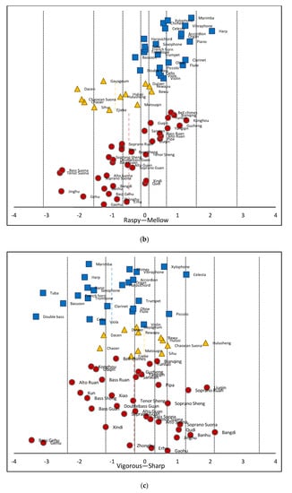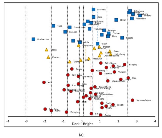 - The range of timbre variation: The range of timbre varies depending on the subject of the study, with larger instrumental variety (i.e., orchestral music) providing better data [34]. Models constructed in this way can be applied more broadly to new timbre samples. In this study, 37 kinds of Chinese instruments were selected. As can be seen from Figure 4, compared with Western instruments, Chinese instruments had a wider distribution range in terms of their timbre evaluation scale. As such, the Chinese instrument samples selected in this paper ensured a diverse range of timbre samples.