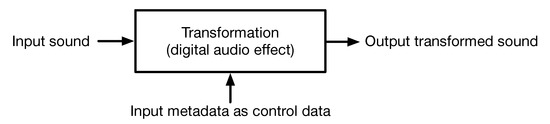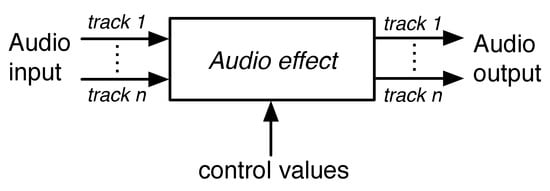 Audio effects are essential tools in contemporary music production and composition. They are applied to enhance the perceived quality of an audio signal or for creative sound design and music composition. To achieve this, sound transformations alter one or more of perceptual attributes, such as loudness, time or rhythm, pitch, timbre, and spatialisation [1,2]. Control values determine the behaviour of the audio effect, which may be set by the user via a graphical user interface (GUI). A basic flowchart of an audio effect is shown in Figure 1.