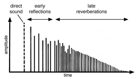 The direct sound is the origin sound and the first to be experienced by the receiver (depending on the distance from the source and on the medium conditions). The early reflections are the first set of reflections that arrive at the listener’s ear and have a large impact on the perception of the size of a room and on colouration of the audio signal. The late reverberation is composed of the build up and decay of a large number of diffuse reflections. The late reflections are often considered to be uncorrelated aspects from the original signal. The time differences of the early reflections and late reverberation are not discernible by the listener due to the integration time of the human auditory system [8]. The transition between early reflections and late reverberation (mixing time) can be found with statistical methods [19,20,21]. When the direct sound is received within a certain time threshold from its first reflection, the listener is able to discriminate different sound phenomena or otherwise perceived as fused together. This effect is called precedence effect, and this time gap, i.e., the listener’s echo threshold, was found to depend on the kind of sonic material [22] and, in more complex way, on some periodical similarities of the audio signal [23,24].