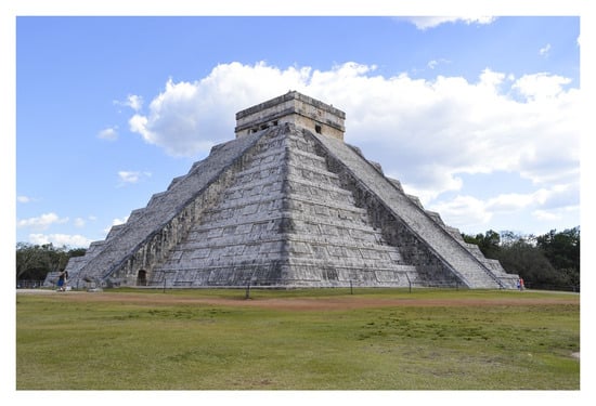 Among a number of sacred sites, examples of architectural constructions aimed at achieving particular sound effects with scenic vibrance were progressively found, such as the pyramids of Chichen Itza, of which the steps create the sound of the bird “Quealcoatzl”. Lubman [54] argues that the echo produced by the Mayan Chichen Itza pyramid deliberately resembles the call of the Quetzal bird, which has been considered sacred in Mayan culture and hailed as the bird messenger of the gods. The sound is produced by periodic reflections of the sound of a hand clap from the stair faces of the steps on the pyramid (Figure 3).