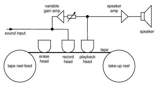 Soon, a number of standard techniques for the creation of tape music were established. Splicing and cutting of tape in various manners, for instance, created different effects of the transition from one sound to another [78]. Tape delay (see Figure 4), manipulation of playback speed, and tape reversal became common practice.
