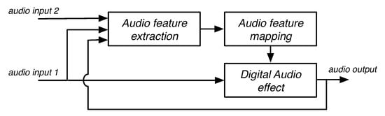 - Cross-adaptive effects—a combination of at least two external-adaptive effects, where the features mapped to control parameters of the effect applied to one signal are extracted from the other.