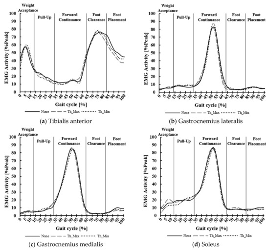 Mean of electromyogram (EMG) activity of all participants in the vibrational stimulation conditions at the threshold intensity: (a) Tibialis Anterior (TA), (b) Gastrocnemius Lateralis (GL), (c) Gastrocnemius Medialis (GM), (d) Soleus (SOL). ‘Th-Max’ means a vibration of 140 Hz was applied at the threshold intensity, while ‘Th-Min’ means a vibration of 210 Hz was applied at the threshold intensity. The solid line indicates the gait phase (Weight Acceptance (WA, 0%~14%), Pull-Up (PU, 15%~32%), Forward Continuance (FCN, 33%~64%), Foot Clearance (FC, 65%~82%), Foot Placement (FP, 83%~100%)).