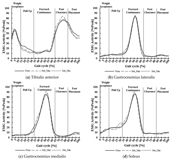 Mean of EMG activity of all participants in vibration stimulation conditions at sub-threshold intensity: (a) Tibialis anterior, (b) Gastrocnemius lateralis, (c) Gastrocnemius medialis, (d) Soleus. ‘Sub-Max’ means a vibration of 140 Hz was applied at sub-threshold intensity, while ‘Sub-Min’ means a vibration of 210 Hz was applied at sub-threshold intensity. The solid line indicates the gait phase (Weight Acceptance (WA, 0%~14%), Pull-Up (PU, 15%~32%), Forward Continuance (FCN, 33%~64%), Foot Clearance (FC, 65%~82%), Foot Placement (FP, 83%~100%)).