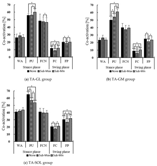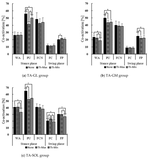 Mean value (± standard deviation) of co-activation of each gait phase according to the vibratory stimulation conditions at threshold intensity of each muscle group: (a) TA-GL group, (b) TA-GM group, (c) TA-SOL group, * indicates statistical significance through post-hoc tests between vibratory stimulus conditions (p < 0.05).
