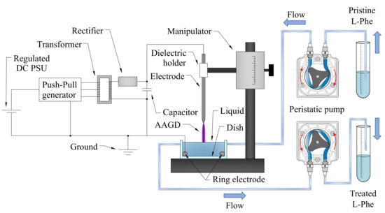 High voltage was produced by a custom power supply consisting of a regulated direct-current power supply (DC PSU), a push–pull generator, a high-voltage transformer, a diode rectifier, and a reservoir capacitor. The discharge gap between liquid surface and the pin of the needle electrode was set at 8.5 mm by using a micromanipulator.