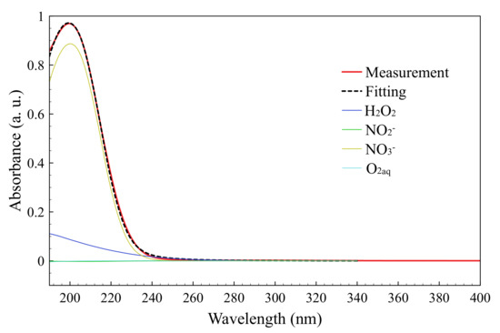 where Absx(λ) is absorbance, ε(λ) is the molar absorption coefficient, l is the optical-path length, and cx is the concentration of the molecule X [34]. The small error in fitting (within 1.5%) observed in Figure 3 is related to the presence of other species in the treated water that had absorbance in the DUV wavelength region, but were not accounted for in the fitting. Mostly H2O2 and NO3− absorption peaks were present in deconvolution when the NO2− peak was negligible.