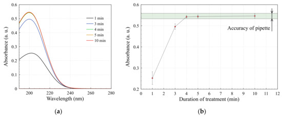 The absorption of the treated liquid increased with an increase of plasma-treatment duration, indicating the increase of RONS concentrations. However, after 4 min, the spectrum shape did not change (Figure 4a), and the absorption spectrum remained at the same level of intensity (Figure 4b), indicating the same level of RONS concentrations in the treated liquids.
