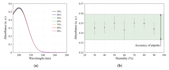 Some variation in the mean of intensity of absorption spectra could be observed with the change of humidity; however, the shape of the absorption peak remained the same (Figure 5a). As was discussed above, considering the error bars represented in Figure 5b, humidity did not have an effect on absorption intensity within the experiment uncertainty. Additionally, the shape of the absorption peak remained the same, suggesting the same ratio among concentrations of produced RONS.