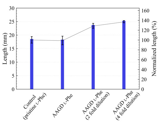 To investigate the effects of 80 mM L-Phe treated with AAGD on plant growth, a radish sprout was placed in L-Phe treated with AAGD under the standard condition. The radish sprout was planted in a pristine 80 mM with L-Phe as a control. Figure 6 demonstrates the length of the radish sprout after hydroponic growth in pristine L-Phe and L-Phe treated with AAGD diluted to various concentrations.