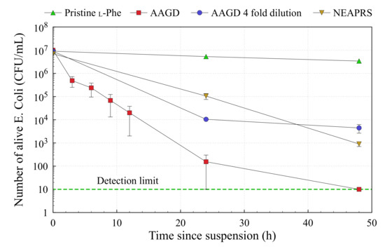 It was reported that in the case of water and other liquids treated by plasma, a low pH of liquid (below 4.7) after treatment is important for a strong bactericidal effect [20]. However, in cases of hydroponic plant growth and other applications in agriculture, a low pH could be harmful for plants, and a bactericidal effect in the neutral pH region (between 5 and 6.5) is desired [18,24]. The bactericidal effect of L-Phe treated with oxygen radicals in a neutral pH region was reported elsewhere [18]. High RONS concentration in liquids treated with AAGD looks promising for a strong bactericidal effect. To investigate the bactericidal effect of L-Phe treated with AAGD, 10 mL/min flow of L-Phe was treated with AAGD under the standard condition. Then, E. coli bacteria at a concentration of 107 mL−1 were suspended in the treated liquid and incubated for various durations. After incubation, the number of survived bacteria was estimated by a CFU assay. Figure 7 demonstrates the effects of incubation time on the number of survived bacteria in pristine L-Phe, L-Phe treated with oxygen radicals, and L-Phe treated with AAGD.