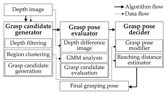 The DBP structure used in this study is shown in Figure 1. DBP consists of three elements: a grasp candidate generator, a grasp pose evaluator, and a grasp pose decider. The grasp candidate generator processes the image obtained by a depth sensor and generates a group of grasp pose candidates. The grasp pose evaluator selects the most appropriate candidate among those obtained from the grasp candidate generator by analyzing the shape of the target object and the surrounding space. The grasp pose decider adjusts the grasp pose to obtain a more appropriate one. Using the foregoing procedure, robotic grasping can be performed without learning using devices such as a graphics processing unit (GPU).