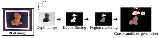 The grasp candidate generator provides grasp poses that are likely to lead to a successful object grasping. In this, three processes are involved: depth filtering, region clustering, and grasp candidate generation.