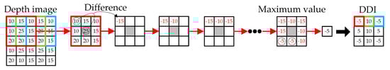 The DDI can be obtained as follows. First, an m × m region is filtered from the upper-left corner of the depth image. Here, the largest difference between the central pixel and the adjacent pixels is used as the new output. Then, the filter moves one pixel to the right according to the sliding-window approach and repeats the operation. At the end of the row, the filter moves to the next column. The corresponding pseudo-code is presented in Algorithm 1 for the case of m = 3, and a sample DDI is shown in Figure 4.