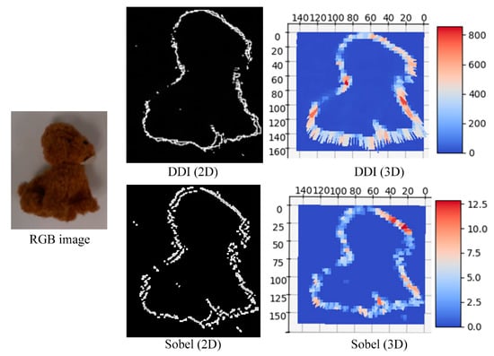 As shown in Figure 5, the DDI has large values at the contour of the object, similar to contour extraction, e.g., using a Sobel operator. However, there is a significant difference. Because a Sobel operator outputs only small values (e.g., 0–10), the depth difference cannot be properly represented. In contrast, the DDI can display both the contour of the object and the depth difference between neighboring pixels. This feature is used to estimate the graspability of the grasp candidates.