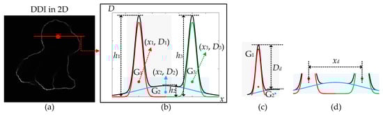 Figure 6a,b shows the DDI and its profile along the grasp candidate indicated by the red line in Figure 6a, respectively. In (b), point (xi, Di) and hi are the average point and the maximum value of each Gaussian model estimated by the GMM, respectively.