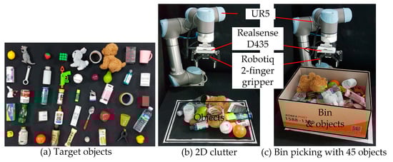 Figure 8 shows the experimental setup, which comprised a UR5 robot, a RealSense D435 RGB-D sensor mounted on the robot arm, and a Robotiq two-finger gripper. The main central processing unit (CPU) was an Intel Core i9-7940X, and the GPU was a GeForce GTX 1080 Ti. Figure 8a shows the 45 different objects used in the experiments. In the 2D cluttered environment shown in Figure 8b, 20 objects were randomly selected among the 45 objects and stacked in the outlined area. In bin picking, as shown in Figure 8c, the 45 objects were used. The objects comprised the Australian Center for Robotic Vision (ACRV, Brisbane, Australia) picking benchmark (APB) [], the Yale-CMU-Berkeley (YCB) benchmark [], the World Robot Summit (WRS) 2018 set, and household items.