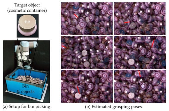 (a) Bin picking filled by cosmetic containers and (b) estimated grasp poses in heavy clutter.
