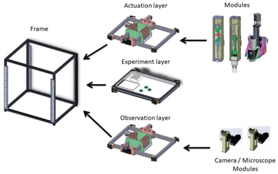 In order to reach a reconfigurable and extendible liquid handling robot, we have employed a modular design building on research in the field of modular robotics [13]. A modular approach allows us to encapsulate complexity while providing a simple plug and play interface for users. Furthermore, this allows non-expert users to configure the robot for a wide range of experiments. To further extend the versatility of the robot, it has two different levels of modularity: layers and modules (see Figure 2). Thus, the robot consists of one structural frame with horizontal sockets, where different kinds of layers are attached by using a cam lever mechanism. These layers can be moved up and down in a few seconds. In its basic configuration, the robot has three layers: an actuation, an experimental, and an observation layer. This default configuration can be easily changed if required by the experiment.