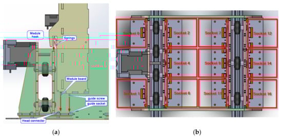 Head of the actuation layer. (a) Mechanism to plug a module on the head, which automatically produces an electrical connection between the electronics of the module and the main controller. (b) Sockets of the head, which can have eleven modules connected at the same time.