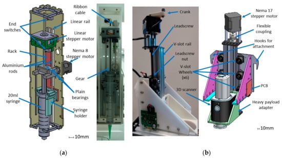 The syringe module has two degrees of freedom. Its main mechanical components are shown in Figure 5a. One Nema 8 stepper motor with a pinion-rack mechanism moves the syringe up and down and a linear non-captive stepper motor (25NCLA-B01) moves the plunger of the syringe. In order to save space inside the module, a linear plain bearing and a rail (Drylin N17, Igus GmbH, Köln, North Rhine-Westphalia, Germany) are used to guide the movement of the syringe. The plunger movement does not need a linear guide for the small syringes as the plunger in the syringe and the linear stepper motor provide enough guidance. In the 20 mL syringe, the friction force of the plunger combined with the longer distance between the motor and plunger can cause problems in some occasions. Therefore, a linear guide was designed with aluminium rods and plain bearings.