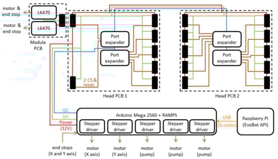 Main electronic components. The dotted lines represent the developed PCBs, and the black rectangles represent the connectors of the sockets and the module boards. Two of the stepper drivers on the RAMPS board are used to control the head; the other three are available to control other devices such as peristaltic pumps. To reduce the number of lines between the Arduino and the head boards, there are expander ports with I2C communications to generate the Chip Select and reset lines for all the sockets.