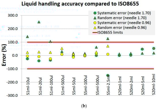 Liquid handling accuracy for the syringe modules in non-contact dispensing. (a) The labels specify the syringe size and the dispensed volume for each test, which was run 30 times to find the systematic and random errors in µL. (b) Errors in µL are normalised using the maximum permissible errors defined by the ISO8655. A test fulfils this standard if the errors are between ±100%. As the standard states, the maximum permissible errors for the nominal volumes apply to every selectable volume throughout the useful volume range of the piston pipette. Therefore, the maximum systematic and the random errors allowed are ±8, ±40, and ±60 µL and 3, 15, and 30 µL for the 1 mL, 5 mL, and 20 mL syringe module, respectively. There are not maximum errors for a 20 mL pipette in the ISO8655. Thus, we have selected the maximum admissible errors for a 10 mL pipette.