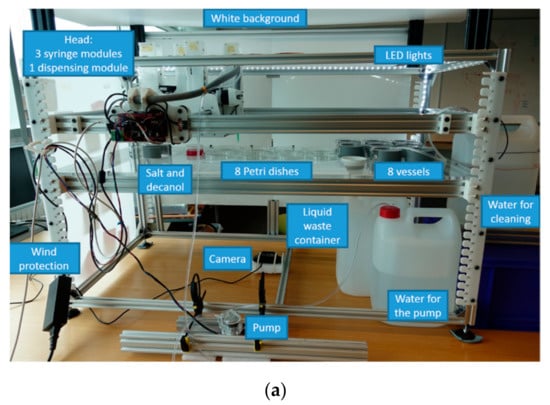 - Nejatimoharrami, F.; Faina, A.; Cejkova, J.; Hanczyc, M.; Stoy, K. Robotic automation to augment quality of artificial chemical life experiments. In Proceedings of the International Conference on the Synthesis and Simulation of Living Systems (ALIFE), Cancún, Mexico, 4–8 July 2016. [Google Scholar]