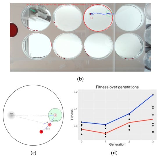 The robot automatically evaluates each experiment based on a fitness function, as shown in Equation (1) and Figure 9c: