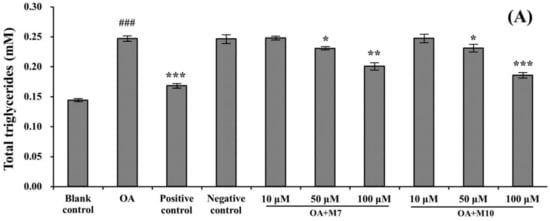 Effects of VIAPW (M7) and IRWWW (M10) from miiuy croaker (M. miiuy) muscle on the intracellular contents of total triglycerides (TG) (A) and cholesterol (TC) (B) in HepG2 cells at the concentrations of 10, 50, and 100 μm. Simvastatin (SV) and FMPLH (M5) were used as the positive control and negative control, respectively. Means ± SD (n = 3) are used to express the experiment data. ### p < 0.001 versus control group; *** p < 0.001, ** p < 0.01, * p < 0.05 versus OA model and negative control groups.