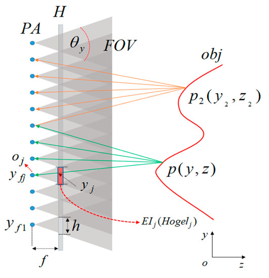 Figure 1 shows the rendering of EIs with a pinhole array for hologram calculation. PA is a pinhole array behind the holographic plane H. The distance between PA and H is f. Obj is a 3D object in space, and and are two object points of obj. The EI is an image rendered from the 3D object to a pinhole. The , for example, is rendered from the pinhole by calculating the projected image from all 3D objects to within the opening angle from the pinhole to this EI. This is coded into the . In this situation, the size of EI is the same as the size of hogel, as well as their coordinates. The EI on the holographic plane has a width of h, and the FOV is dependent on the opening angle of the EI to the corresponding pinhole in the y direction. Each EI is closely adjacent to other EIs. The coordinate of j-th pinhole is , and the projections of point and within the FOV to each pinhole are demonstrated. The intersections of projection lines to each pinhole on the holographic plane are coordinates of the projected points of EI. For example, in Figure 1, is the coordinate of EI in the y direction, which can be expressed as follows:
