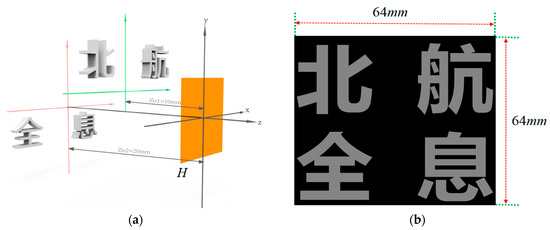 The geometric relationship for hologram calculation: (a) the side view of the holographic plane H and 3D model; (b) the front view of the 3D model. The first layer Chinese characters are the abbreviation of “Beihang” University and the second layer Chinese characters mean “Holography”.