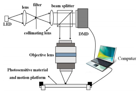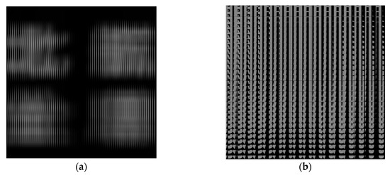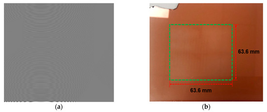 The overall diagram of the holographic printer is shown in Figure 4. The light from the LED is filtered and collimated to illuminate the digital micro mirror (DMD) with a resolution of 1024 × 768 pixels. A small portion of the calculated hologram with a resolution of 600 × 600 pixels is first zero padded to the same resolution as the DMD and then loaded into the DMD for display. The modulated light from the DMD is imaged on the photosensitive material through the objective lens, and this small portion of the hologram is printed. Controlled by the computer, the motion platform is moved to the next position to print the next hologram section. With this holographic printer, the maximum size (a 200 × 200 mm hologram with pixel pitch of 0.318 μm) can be printed on a photoresist plate. The part of the calculated hologram and the printed hologram are shown in Figure 5a,b, respectively.