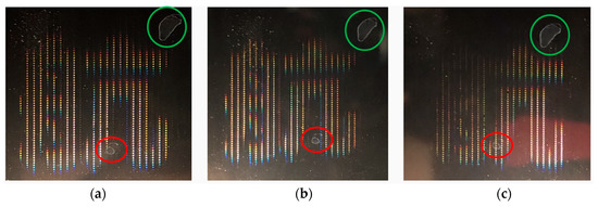 (a–c) Three different images captured by the camera focused on the holographic plane.