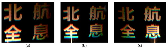 The large hogel size in the first experiment means that human eyes can easily distinguish each hogel on the holographic plane. The 3D image, viewed by the human eye, is comparable to watching through a fence. In order to reduce the fence effect and improve the quality of the displayed result, the second experiment is designed and carried out using the same model as the first experiment, but with different parameters. In the second experiment, the distance between the pinhole array and the holographic plane is mm. In this situation, each hogel has a resolution of 700 × 277 pixels, corresponding to the physical size of 0.22 × 0.09 mm. The sampling pitch in each EI is set as 1 μm and the resolution of each EI is 222 × 88 pixels, which is the same as in the first experiment. The number of EIs is 287 × 725. The resolution of the full light field image is about 63.7K × 63.7K in this experiment. Other parameters are all the same as the parameters of the first experiment. The calculation time of this hologram is approximately 37 min. Figure 8 shows the three reconstructed images. Video S2 shows the 3D reconstruction from different viewing angles.
