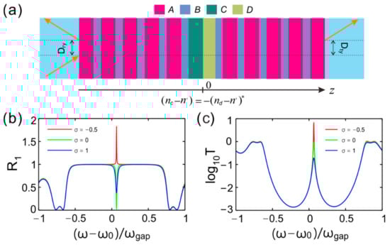 We set the incident light as a TM wave, and the incident angle was θ = 20°. When light obliquely impinged upon the PCs from the left, Figure 2a provides the reflectance spectra for three different values of gain-loss coefficient σ, where (ω − ω0)/ωgap is the normalized frequency and ωgap = 4ω0arcsin│(nb − na)/(nb + na)│2/π is the photonic bandgap [50]. The center frequency of the bandgap was defined as ω0 = 2πc/λ0. One can see that there was a bandgap structure in the reflectance spectrum for each fixed coefficient and a defect mode located at the middle of the bandgap. The reflectance of defect mode was zero, viz. R1 = 0 was the coefficient σ = 0. For σ > 0, such as σ = 1, the reflectance 1 > R1 > 0 and a partial incident light was reflected by the PCs. The reflectance surpassed 1 as the coefficient σ < 0. The loss and gain in the defect can both enhance the reflectance of the defect mode. Figure 2b gives the transmittance varying with the normalized frequency. Light could not transmit the PCs as the frequency of wave was in the range of the bandgap, except for the defect mode. As σ = 1, the incident wave could overall pass through the structure for the defect mode, i.e., T = 1. The transmittance was T < 1 for the defect mode as the coefficient was σ > 1, while the transmittance was T > 1 for the defect mode as the coefficient was σ < 1. The loss or gain in the defect can reduce or enhance the reflectance of the defect mode, respectively.