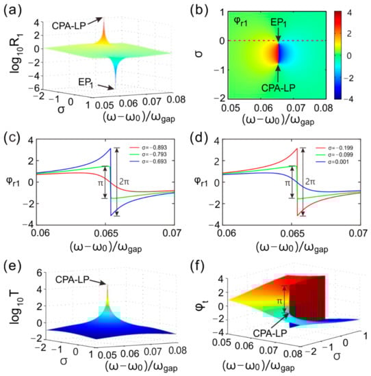 Figure 2a demonstrates the reflectivity in the parameter space composed of the normalized frequency (ω − ω0)/ωgap and gain-loss coefficient. One can see there is a peak and a valley in the parameter space. The peak value was R1 = 1.03 × 105 and it can be viewed as +∞ in our calculating accuracy. The maximum point was the CPA-LP, which located at [(ωLP − ω0)/ωgap = 0.0654, σLP = −0.79]. The valley located at [(ωEP1 − ω0)/ωgap = 0.0654, σEP1 = −0.1] and was an EP labeled by EP1. The reflectance of light at EP1 was R1 = 1.33 × 10−6, which is approximately equal to 0 in our calculating accuracy. The non-Hermitian system can be viewed as a resonant cavity, of which the defect is the cavity body and the Bragg gratings are reflectors. The resonance cavity and gain-loss coefficient of the defect collectively induced the CPA-LP and EP1. Next, we demonstrate the characteristics which approve the CPA-LP and EP.