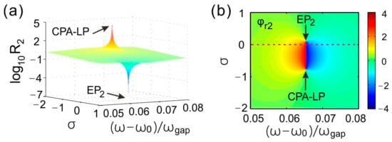 As the light incident from the right, the reflection coefficient was denoted by r2 = |r2|exp(iφr2). Figure 3a gives the reflectance in the parameter space. There were also two extreme points as the normalized frequency and gain-loss coefficient increased. The minimum was labeled by EP2 and located at [(ωEP1 − ω0)/ωgap = 0.0654, σEP2 = 0.1], while the maximum was the CPA-LP and located at [(ωLP − ω0)/ωgap = 0.0654, σLP = −0.79]. The positive gain-loss coefficient represented loss and negative gain-loss coefficient represented gain, respectively. When light was incident from the left, the position of EP1 showed that gain in materials was required, and while the light was incident from the right, loss was required to carry out the singularity of EP2. These properties indicate that the EPs were dependent on the directions of light incident form the left and right. The dependence on directions for EPs resulted from the asymmetry of the defect and the non-Hermiticity of PCs.