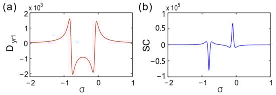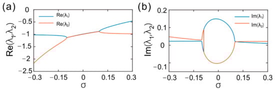 As the gain-loss coefficient σ changed, the real and imaginary parts of eigenvalues are depicted in Figure 4a,b, respectively. For the incident and scattered waves, the scattering matrix in PCs can be written as S = [t r1; r2 t], which is the counterpart of Hamiltonian in quantum systems [51,52]. The eigenvalues of S-matrix were λ1,2 = t ± (r1r2)1/2 and the eigenvectors were (r11/2, ±r21/2). The eigenvalues coalesce and the eigenvectors degenerated at (r1r2)1/2 = 0, which was defined as EPs of eigenvalues. That is, the EPs could be derived by r1 or r2 = 0. We generally searched for EPs in the parameter space on conditions of R1 or R2 = 0. The reflection coefficient complex phase φr1 and φr2 were bound to experience a dislocation as R1R2 = 0, which is an unique characteristic of EPs. The zero reflection and complex phase dislocation can be utilized to seek out EPs. When σ < σEP1 and σ > σEP2, the real parts of the eigenvalues split into two branches. When σEP1 < σ < σEP2, the real parts of eigenvalues degenerated. On the whole, the curves of real parts were anti-crossing and the imaginary part curves were crossing around the EPs for the eigenvalues. The imaginary parts of eigenvalues degenerated at EPs as well. These characteristics are often used to confirm EPs.
