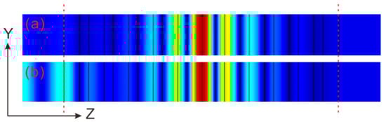 Figure 5a gives the distribution of the electric field for EP1. It demonstrates that the power of electric field was mainly restrained in the defect. The electric field intensity decreased exponentially as the coordinate extended to the left and right from the 0 point. The distribution of electric field further manifested that EP1 was the defect state (or transmission state). Figure 5b provides the electric field distribution of CPA-LP. The electric field mainly distributed the defect as well. This means that CPA-LP was also a defect state. Two Bragg gratings formed the resonance of cavity, together with some appropriate gain in defect, to result in the CPA laser state.