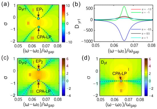 In the parameter space, the complex phase of the reflection coefficient changed sharply as the normalized frequency and gain-loss coefficient increased near EPs and CPA-LP. Figure 6a gives the GH shift of reflected light around EP1 and CPA-LP. The interested area is divided into three parts by dotted lines. EP1 and CPA-LP are exactly on the dotted lines. At EP1 and CPA-LP, one can see that the GH shift was infinite, so EP1 and CPA-LP were the singularity of the GH shift. Except for EP1 and CPA-LP, the GH shift on the dotted lines was 0. Otherwise, the GH shift in region I and III was positive, while the GH shift in region II was negative. The GH shift was greater as the parameters increasingly approached EP1 and CPA-LP. In our accuracy, the positive GH shift could be as high as 106λ, and the negative GH shift could be as high as −105λ. The sharp change in the complex phase of reflection coefficient near EPs and CPA-LP generated the giant GH shift. The singularity of the GH shift at EPs and CPA-LP was also an intriguing characteristic.