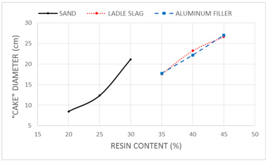 Figure 2 shows the fresh consistency variations of the fresh mixes for each target material in its optimum resin dosage range. Considering the workability criterion, the sand samples required a dosage above 20% resin, while the LS and the AF samples’ workability started with a minimum resin content of 35%. The excess of resin was observed for dosages above 30% in the case of sand, and 45% for the LS and AF combinations. The higher resin content required for the LS and AF samples is probably related to the high content of these materials in the finest particles, which are 66.23% and 31.40% under 80 µ, respectively. The fresh consistency test expresses the combinations consistency as the “cake diameter” of the fresh PPC sample after a shaking process, defined in the European Standard EN 1015-3 [19].